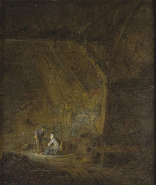 A BARN INTERIOR WITH TWO PEASANTS CONVERSING