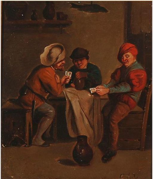 Inn scene with three card players. Inscribed Ostade