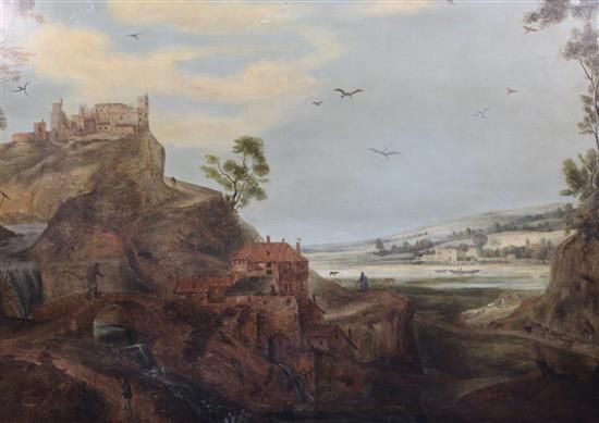 | Extensive landscape with hill top village, figures, cattle and river beyond | |