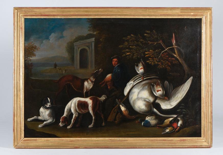 | Trophée de chasse gardé par des chiens et un chasseur dans un paysage | |