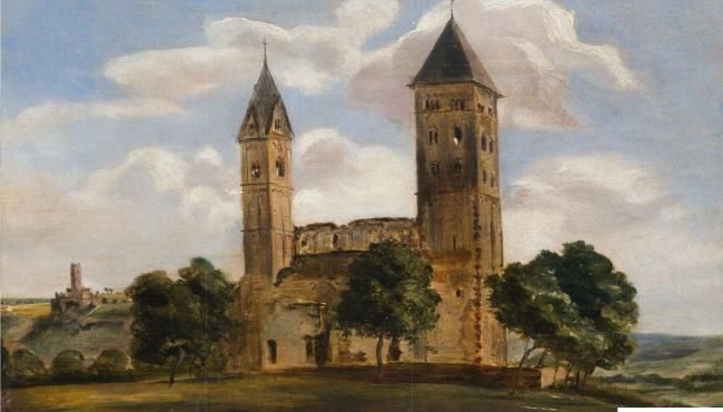 Etude d'église romane dans un paysage vallonné