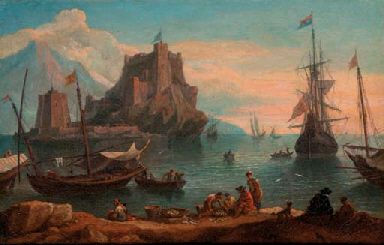 | A Mediterranean port with fisherfolk in the foregound, a Dutch man-o'-war beyond | |