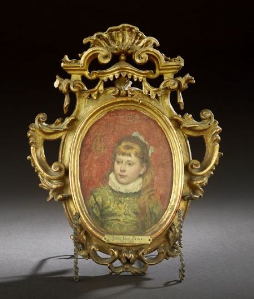 | a charming oval oil-on-panel portrait of a young girl with a white ruff and a blue hair ribbon | |