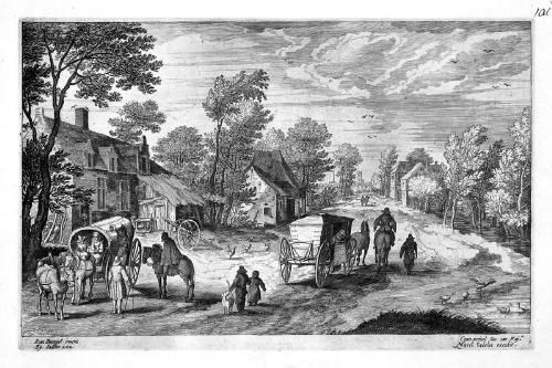 | Dorfstraße mit zwei Karren / Küstenufer mit Fischern und Händlern / Flußlandschaft | |