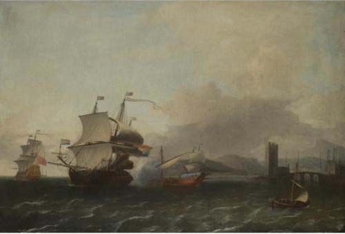 | DUTCH AND ENGLISH SHIPPING OFF A MEDITERRANEAN COAST, WITH A MAN-O'-WAR FIRING A SALUTE TO A STATE BARGE | |