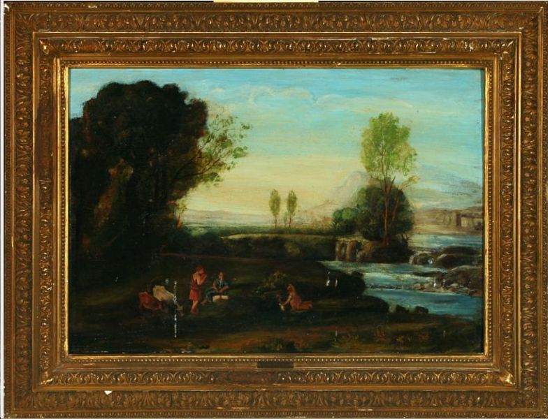 Archaic landscape with animals and figures at a stream