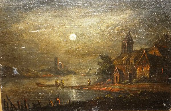 Moonlit river landscape with figures in a punt in foreground, a chapel mid ground, a tower in the distance