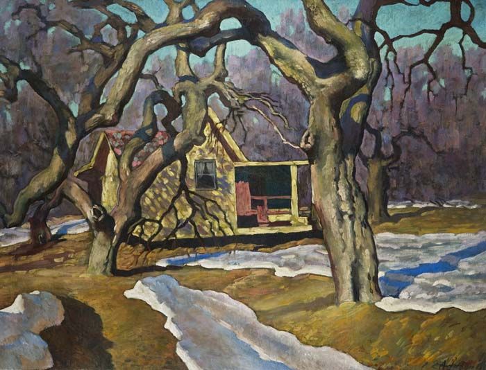 Schneeschmelze, Gartenhaus unter bizarren Bäumen