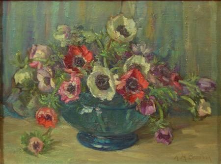 STILL LIFE WITH ANEMONES IN A BLUE GLASS BOWL