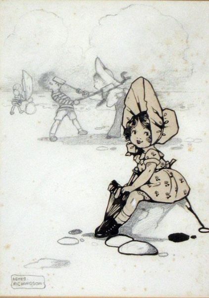 | On the Beach, a child seated on a rock holding a parasol and wearing bonnet | |