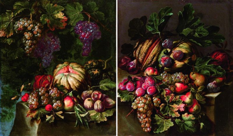 | a) Natura morta di frutta con zucca e uva su lastra di pietra, b) Natura morta di frutta con fichi, pere e uva | |