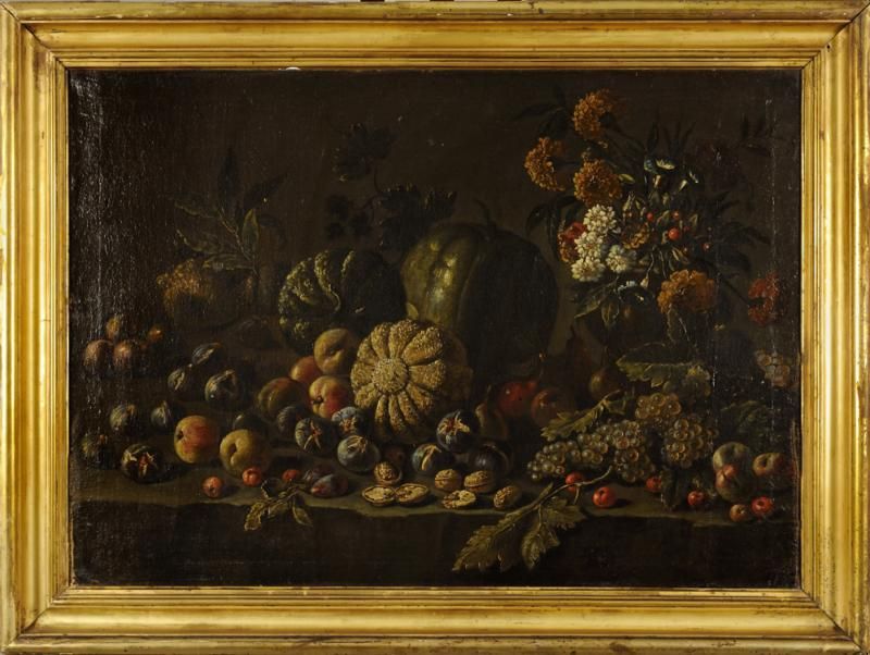 | Nature morte au melon, figue, pêches, bouquet de fleurs sur un entablement de pierre | |