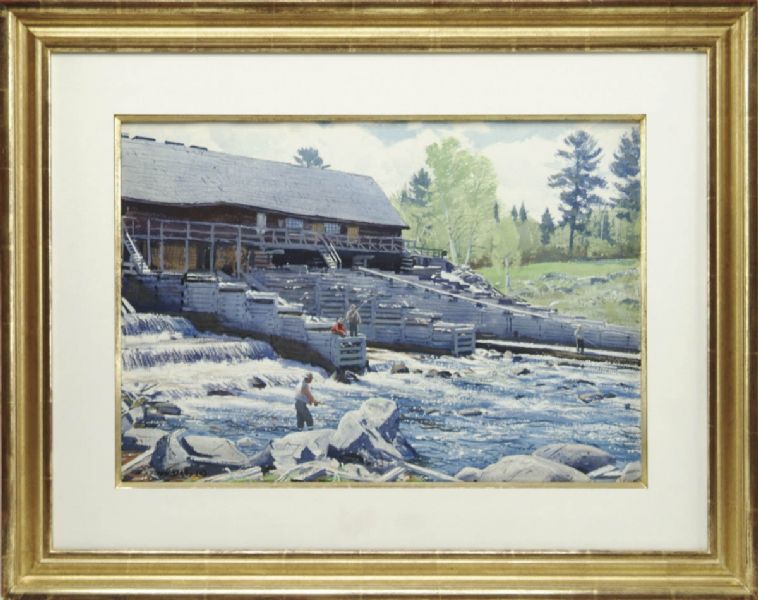 | Watercolor Outstanding watercolor spring/summer scene shows a large wooden dam with building having three fly fisherman, one on each side and one in the middle | |