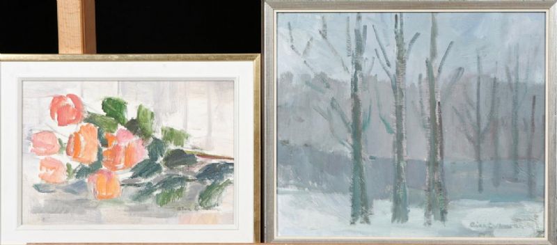 Parklandskap i vinterskrud samt blomsterstilleben.