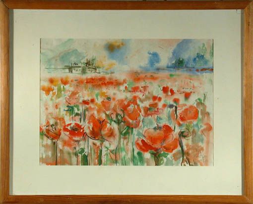Blühendes Mohnfeld, im Hintergrund ein Bauerngehöft