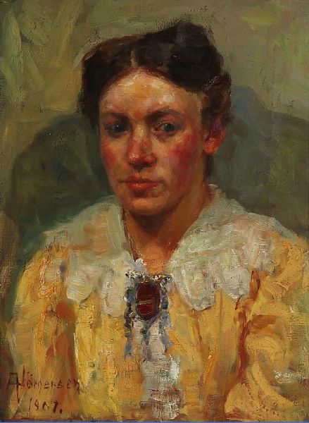 | Portrait of a woman in a yellow dress with a red brooch. | |