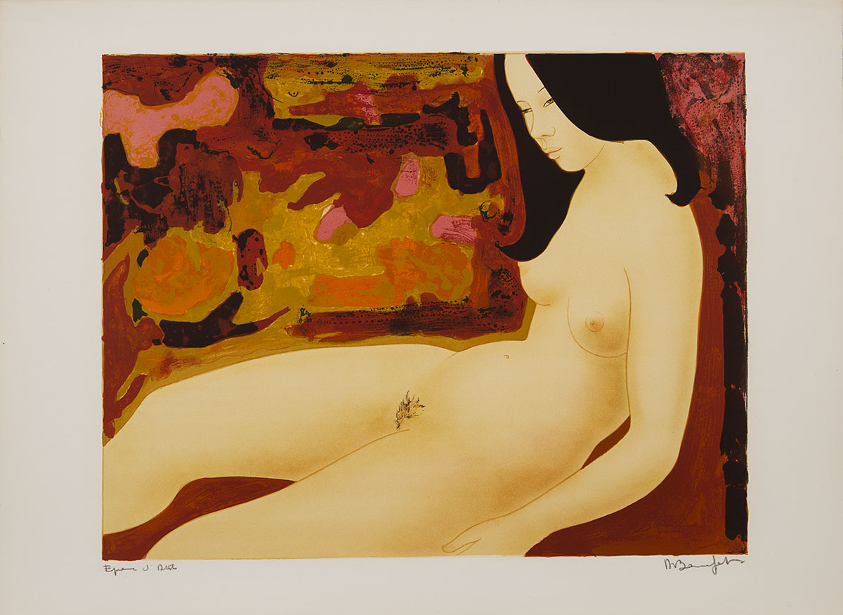 Femme nue assise fond coloré
