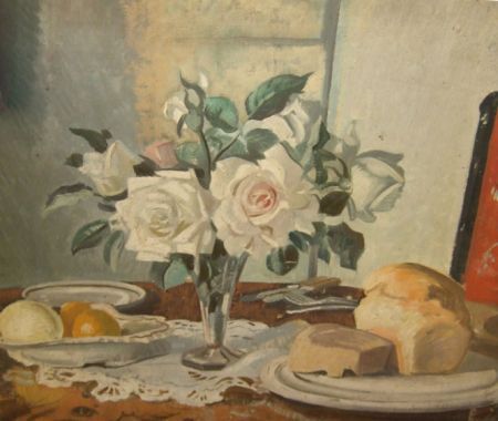 Still Life Study of Bread on a Board and Roses in a Glass Vase on a Table
