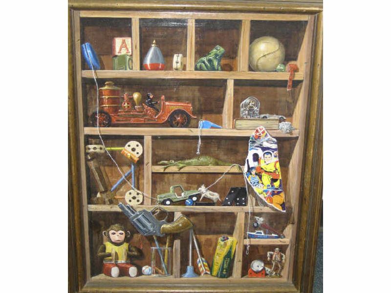 | Trompe l'oeuil depicting a shadowbox filled with collectible toys, 1980 | |