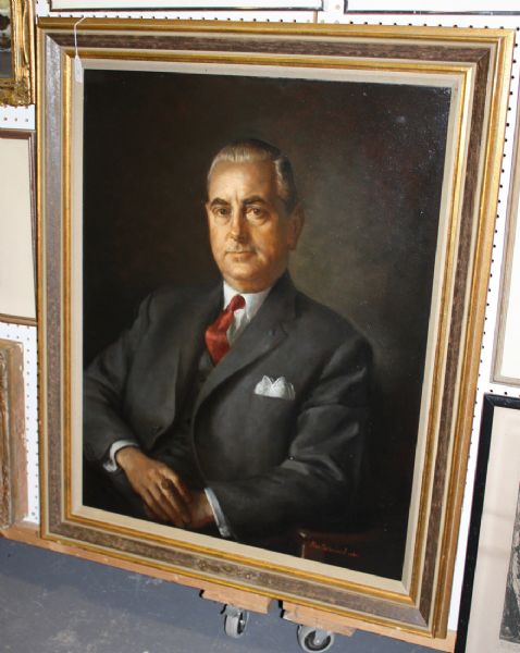 Half Length Portrait of a Gentleman wearing a Grey Suit, with a White Shirt and Red Tie