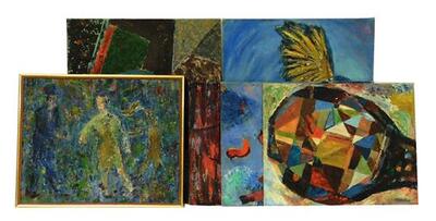 one framed and five unframed works on canvas board: four 16" x 20", one of which is framed, and two 24" x 20", subjects include portraiture, abstract compositions and birds, all with expected wear including scratches and wear to edges, as found.[Alan | |