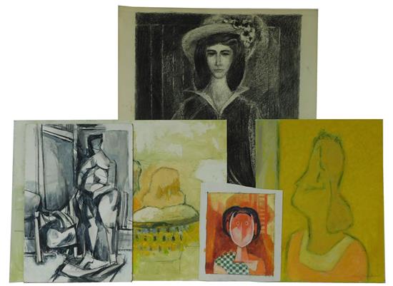| five works of art depicting figural subjects, various media: charcoal on paper depicting woman in hat with flowers | |