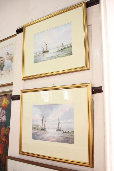 A pair of harbour scenes, moored fishing boats foreground, distant shoreline