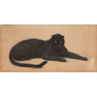 Zwarte panter, liggend. Zwart, blauw en geel potlood