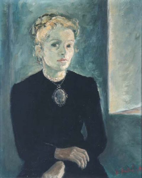 Hüftbildnis einer jungen Frau mit schwarzem Kleid