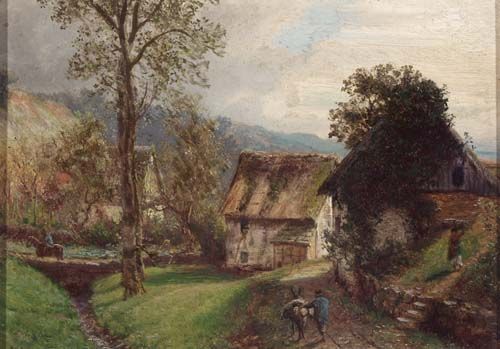 | Blick auf ein Dorf - Sonnenbeschienener Rand einer dörflichen Siedlung mit Häusern, Bächlein und Figurenstaffage | |