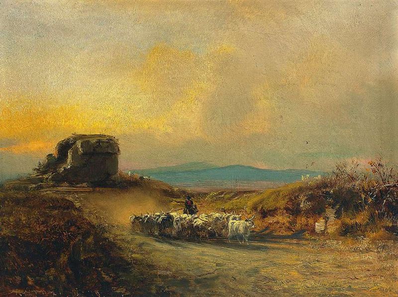 Heimkehrende Langhornrinder in der Römischen Campagna