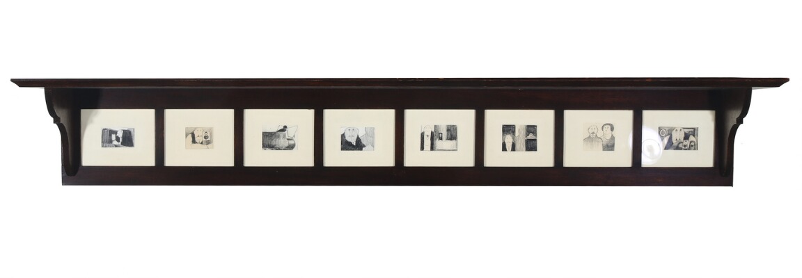 An oak shelf with eight original drawings from the artist's universe.