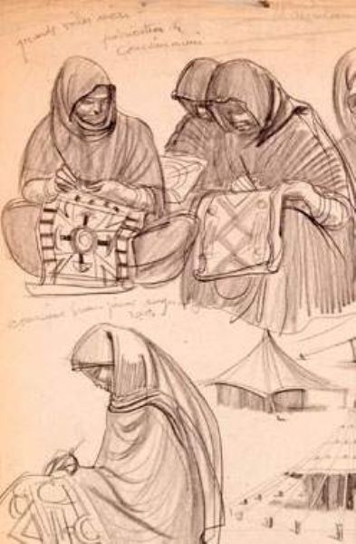 Etude de femmes qui brodent des coussins, de visages et de tentes