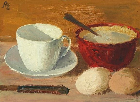 Stil life with a cup, two eggs and a bowl of sugar
