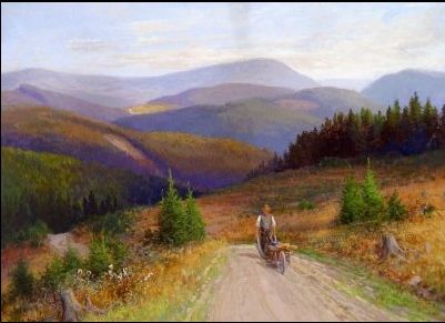 Bauer mit Schubkarre in Mittelgebirgslandschaft