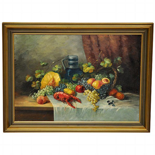Stilleben med frukter, kräfta och karaff. Krackelerad duk, slitage.