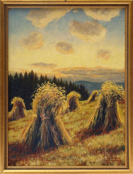 Abgeerntetes Getreidefeld mit Garben vor weitem Landschaftshintergrund