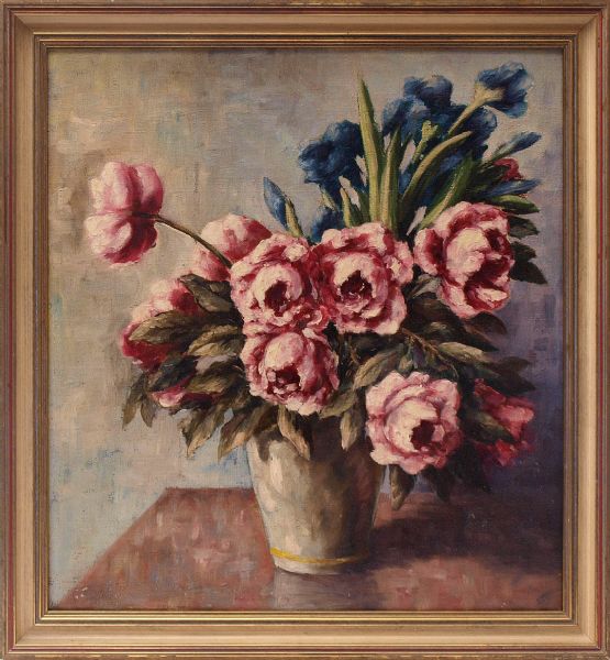 Blumenstrauß in Tonvase vor changierendem Hintergrund