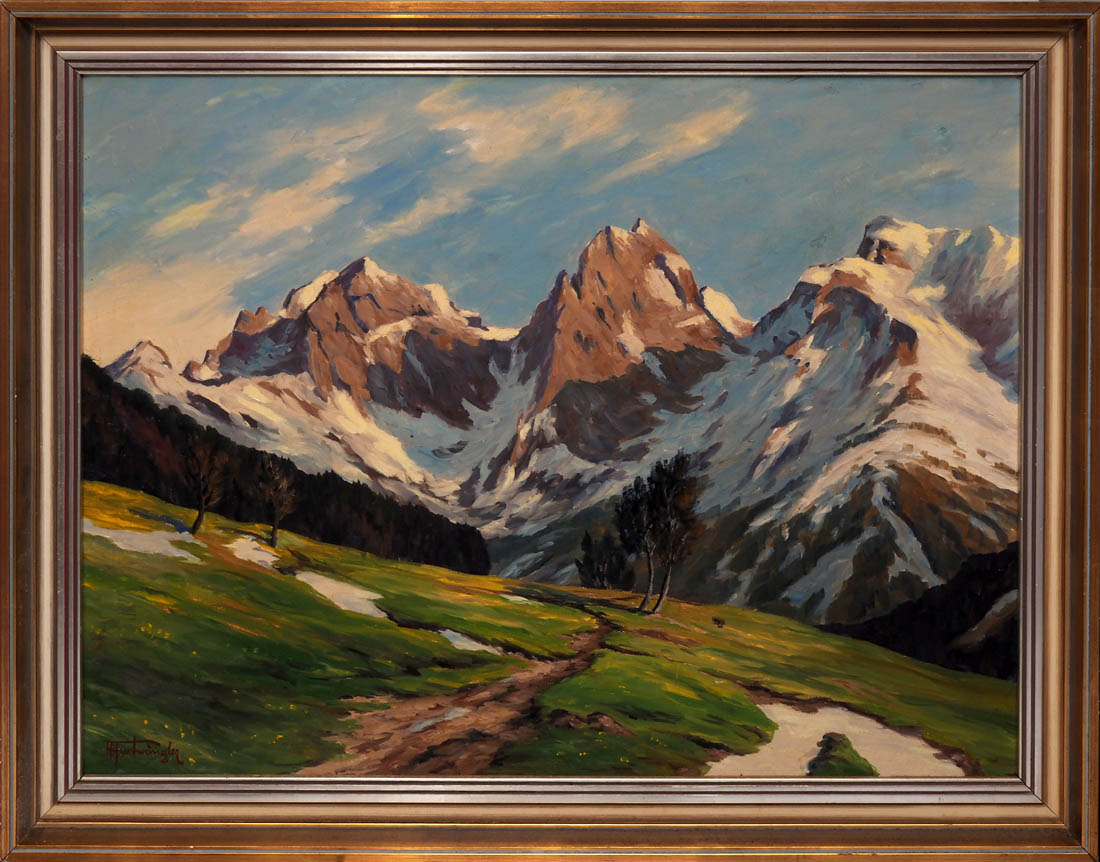 Frühlingslandschaft im Gebirge, im Hintergrund die noch schneebedeckten Berge