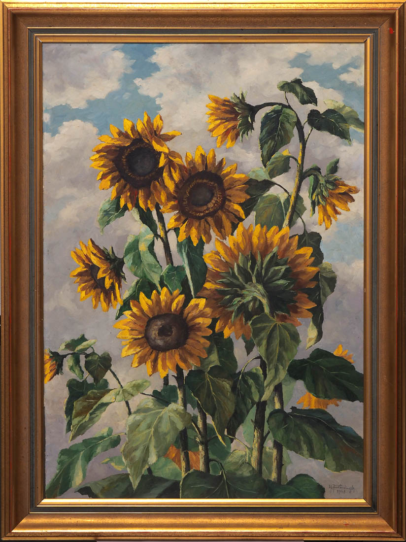 Gruppe von Sonnenblumen vor bewölktem Himmel