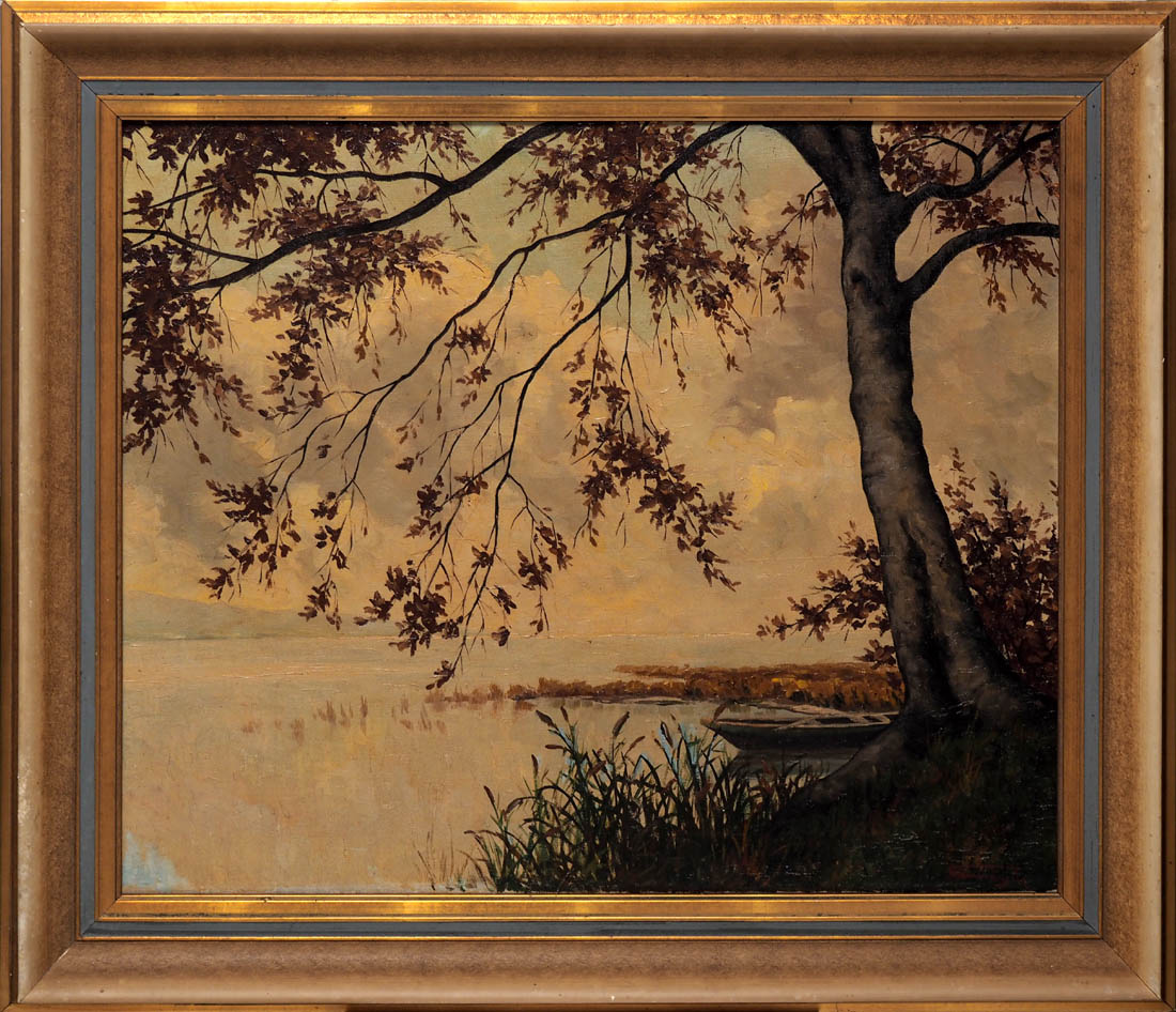 | Herbstliche Partie am Bodensee, im Vordergrund ein Nachen unter einem herbstlich verfärbten Baum | |