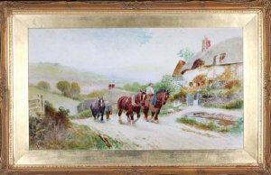 A village street scene with ploughmen and their horses passing a thatched cottage