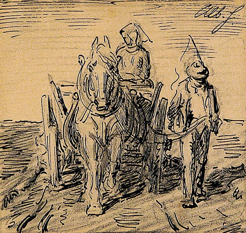 Bauern mit ihrem Pferdefuhrwerk bei der Heimkehr vom Feld