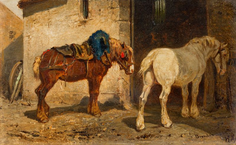 Schimmel und brauner gesattelter Ackergaul vor Stalltor.