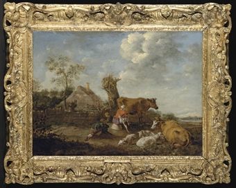 | A pastoral landscape with a milkmaid milking beside a cottage | |