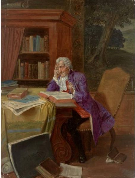 Eleganter Herr im Habit des Rokoko beim Lesen in der Bibliothek.