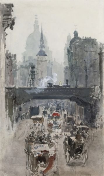 | A steam engine passing over Ludgate Hill, St Paul's beyond | |