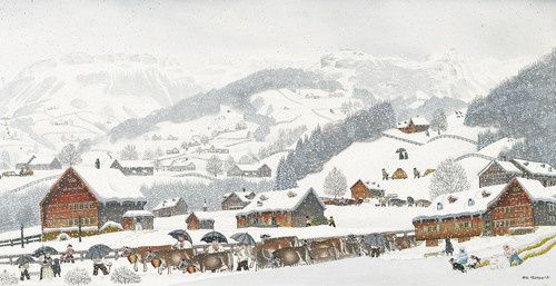 Appenzeller Winterlandschaft mit Kühen und Bauern