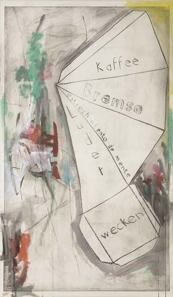 Oil pastel, ink, charcoal and graphite on paper laid on canvas