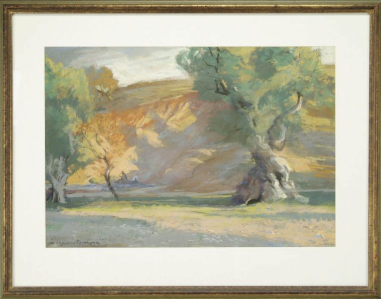 | Pastel outdoor scene shows a hill and trees with two figures seated at base of hill. Probably a California scene | |